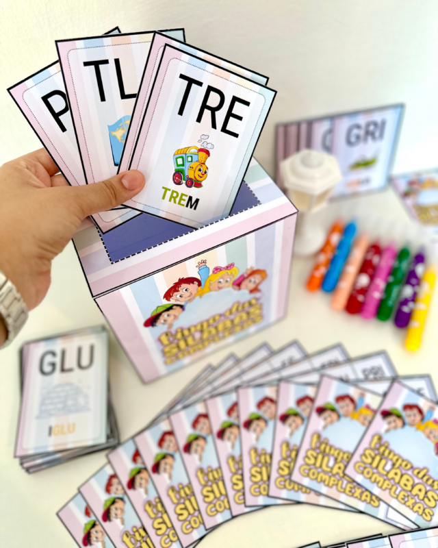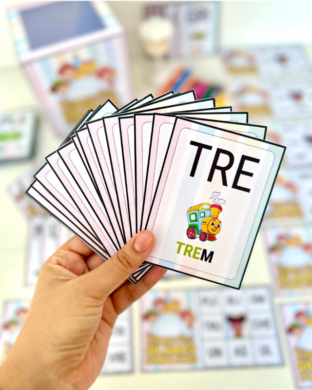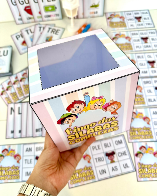 O arquivo vai em PDF pronto para impressão, e inclui 20 cartelas diferentes e fichas ilustradas das sílabas complexas.