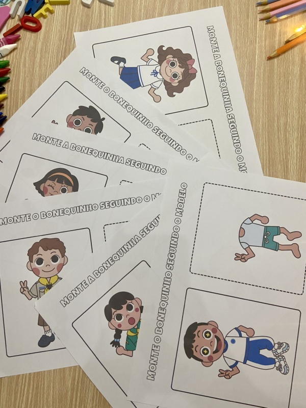 A apostila possui 8 páginas com 6 opções de montagem dos bonequinhos, para a criança observar o modelo e reproduzir seguindo os mesmos elementos.