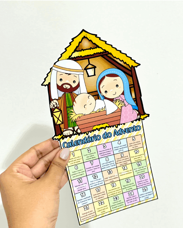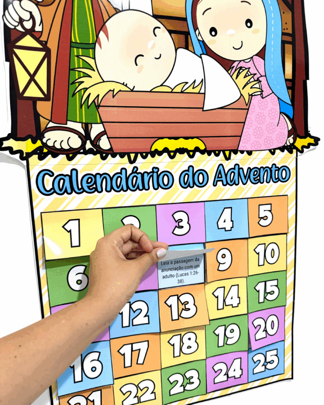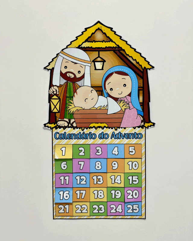 Cartaz Calendário do Advento com Presépio para trabalhar o tema com crianças da Educação Infantil e séries iniciais do Ensino Fundamental, e também funciona para escolas dominicais.