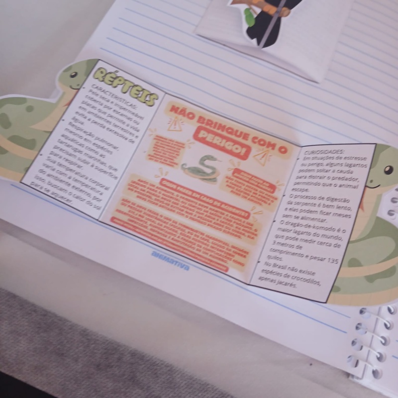 Cada aba revela informações, curiosidades e desafios para as crianças explorarem o mundo dos animais de forma lúdica e significativa.