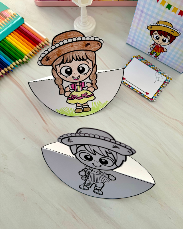 Arquivo Correio Elegante com caixinha e fichas para utilizar no momento da brincadeira. E o arquivo acompanha o arquivo Personagens Dançantes para colorir na opção menino e menina.