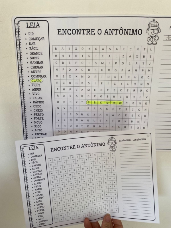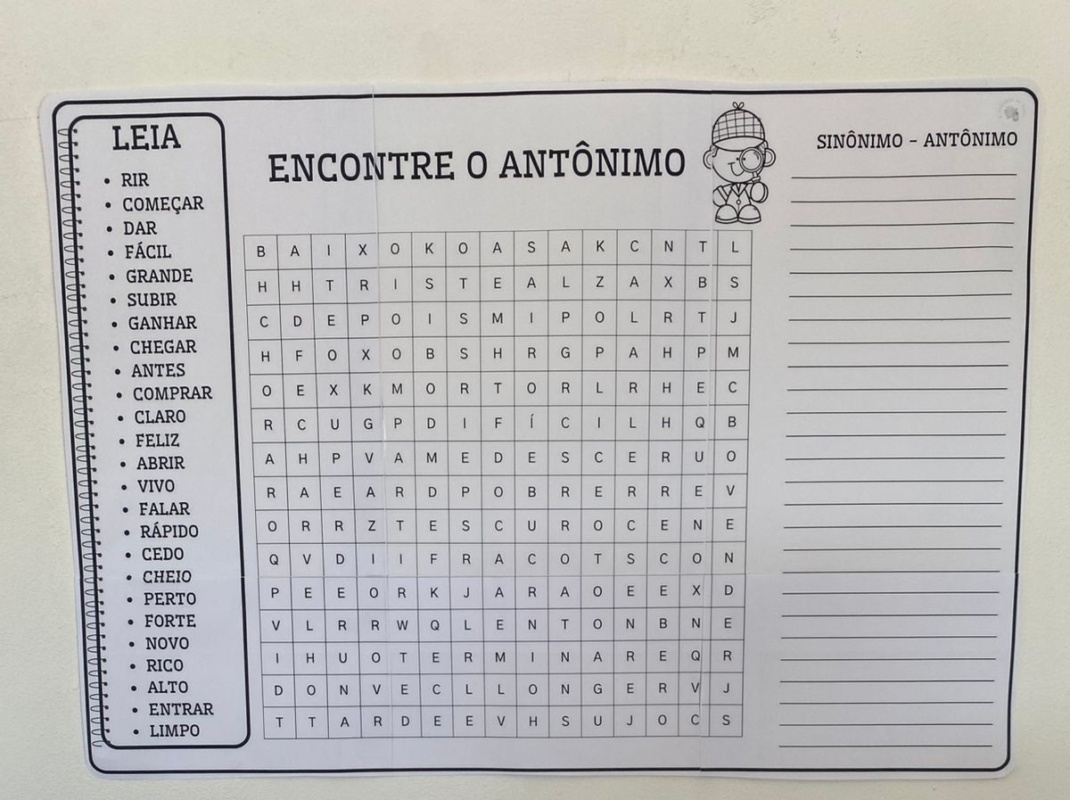 O aluno lê a lista de palavras e procura, no caça-palavras, o seu antônimo correspondente, desenvolvendo leitura, vocabulário e atenção de forma lúdica.