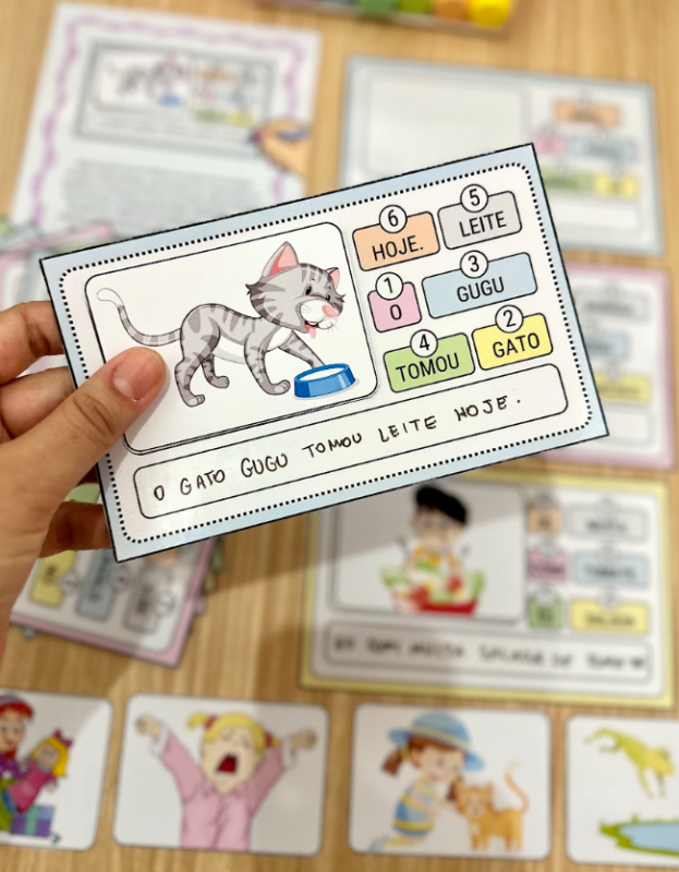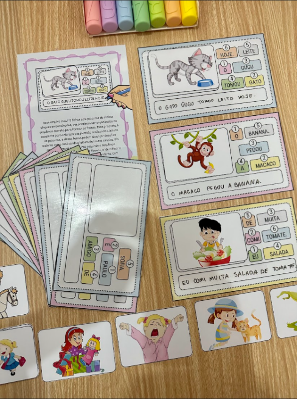 Esse arquivo inclui 12 fichas com palavras de sílabas simples embaralhadas, que precisam ser organizadas na sequência correta para formar as frases.