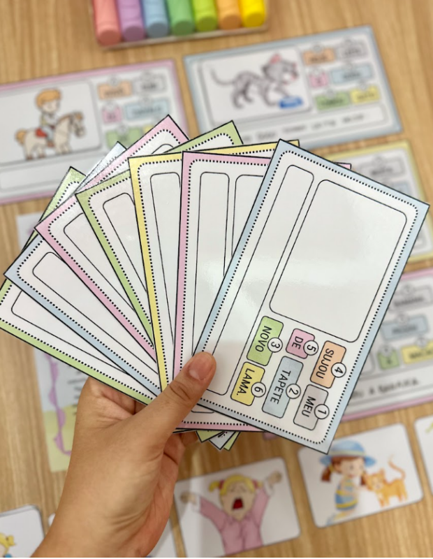 Essa proposta é excelente para crianças que já estão realizando a leitura de palavras, e dessa forma podem alcançar desafios maiores como realizando a leitura de frases simples. Ela deverá escrever as palavras seguindo a sequência indicada, e após isso ler a frase que formou, e identificar a figura que se encaixa no espaço correspondente.