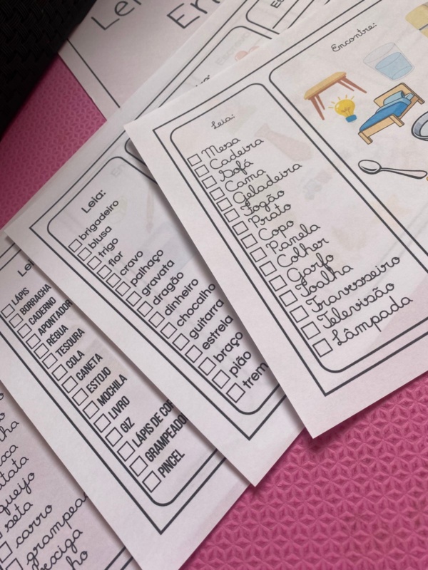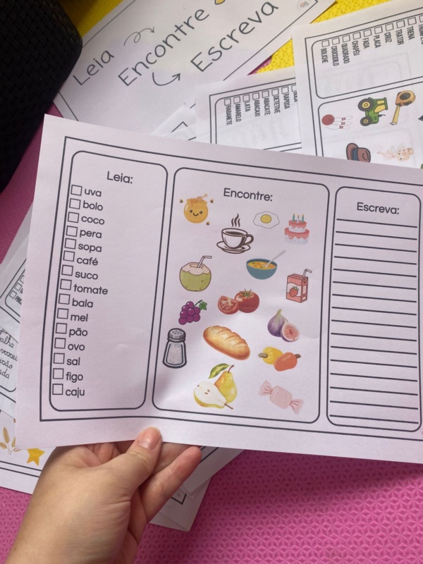 Trabalha leitura, associação imagem-palavra e escrita.