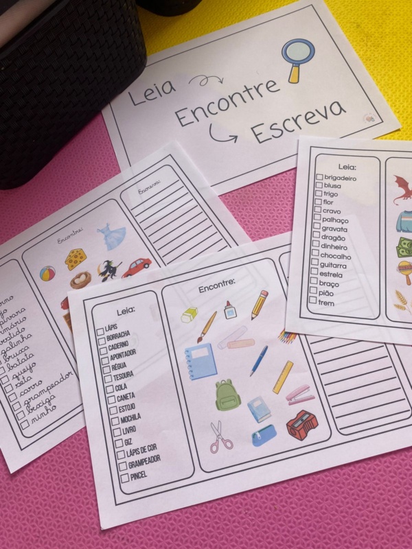Os alunos leem as palavras, encontram as imagens correspondentes e depois escrevem, estimulando leitura, atenção e escrita.