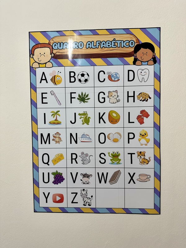 Quadro Alfabético já ampliado e também na opção A4, ideal para turmas de educação infantil e primeiro ano. Esse quadro vai com as letras e com uma figura que inicia com cada letra, facilitando a compreensão da consciência fonêmica e a familiaridade com o nosso sistema alfabético.
