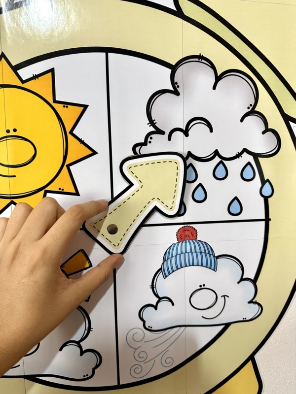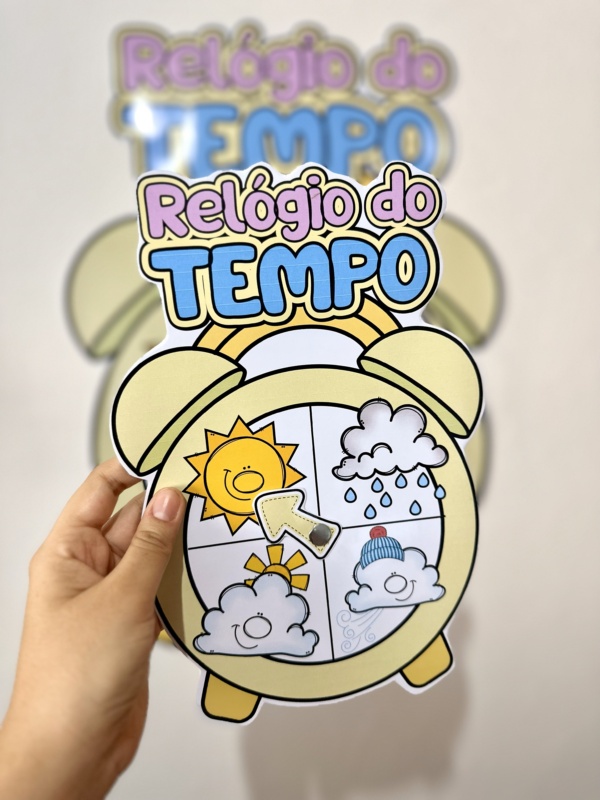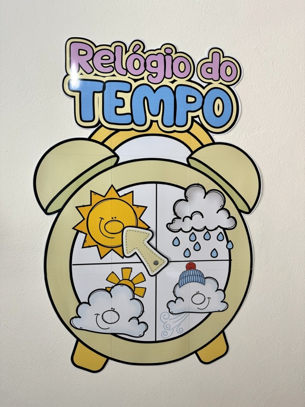 Relógio do tempo interativo, vai nas opções ampliado (75 cm de altura por 63 cm de largura) e A4. Esse recurso é excelente para trabalhar as mudanças climáticas diárias com as crianças, e inserir na rotina essa sugestões interativa trabalhando também a observação dos elementos externos e das estações do ano e suas características, além do desenvolvimento das percepções sensoriais de acordo com o clima de cada dia.